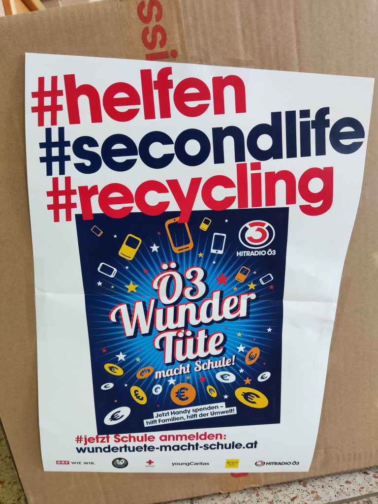 Im November 2023 bis zum Jänner 2024 haben wir als Schule bei der Ö3-Wundertütenaktion teilgenommen. Insgesamt kamen in unsere Schule 183 Handys zusammen. Im Gesamtranking belegten wir deshalb den 14. Platz. Vielen Dank an alle, die ganz fleißig ihre alten Handys gesammelt und bei uns abgegeben haben. Ein großes Dankeschön auch an unsere Schulsprecherin Julia Potzmader, die die Aktion ins Leben rief.