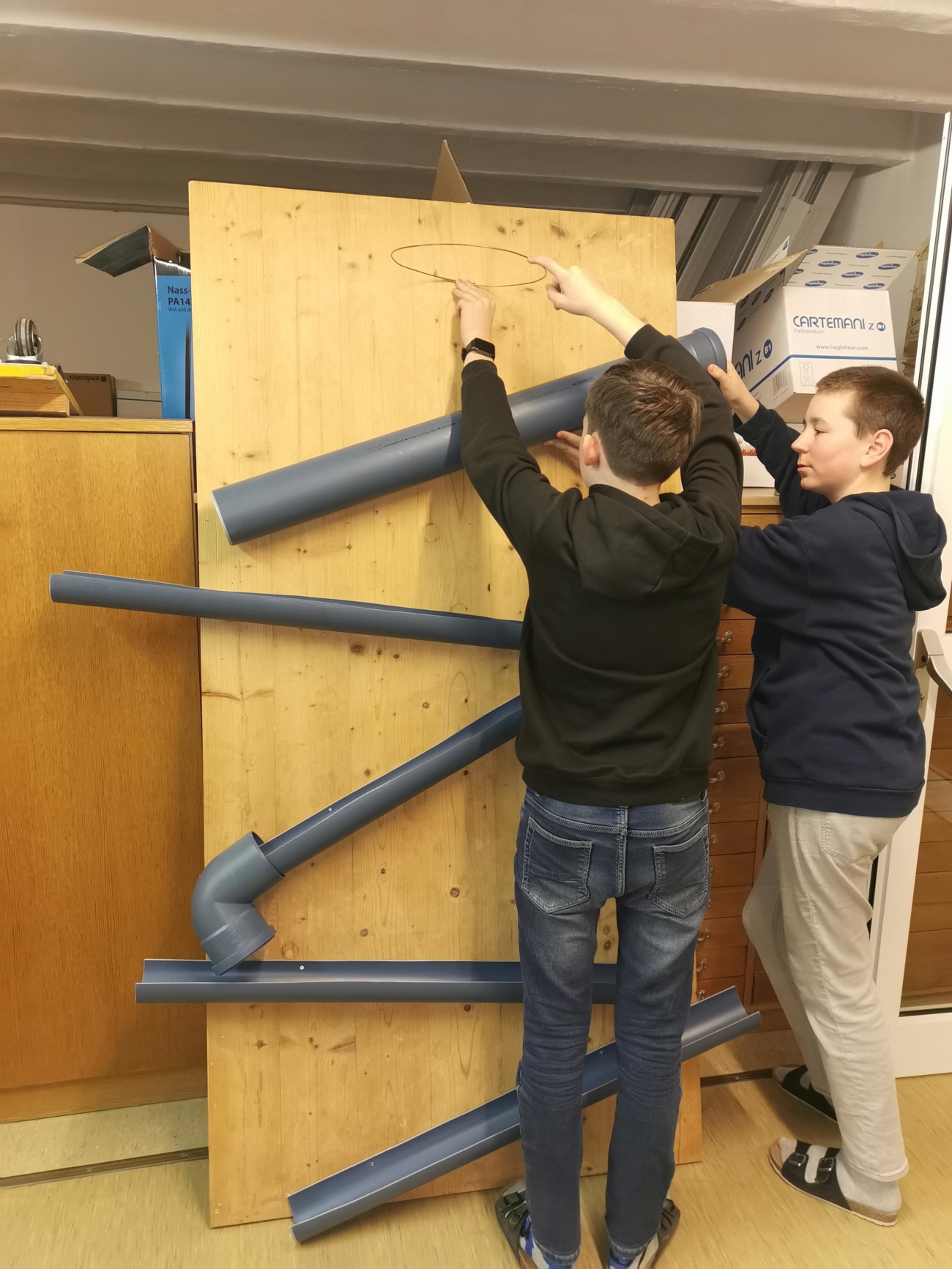 Das Wahlpflichtfach „Leonhofen.Aktiv“ ermöglicht die Umsetzung kooperativer Projekte in den Schulgemeinden Ruprechtshofen und St. Leonhard/Forst. Im 2. Semester fertigen die Teilnehmer/innen für die Außenanlage des Kindergartens St. Leonhard/Forst ein Tipi, ein Holzpferd und zwei Kugelbahnen an. Wie auf den Fotos ersichtlich ist, sind die Arbeiten schon fortgeschritten und wir freuen uns schon auf die Projektpräsentation am Ende des Schuljahres.