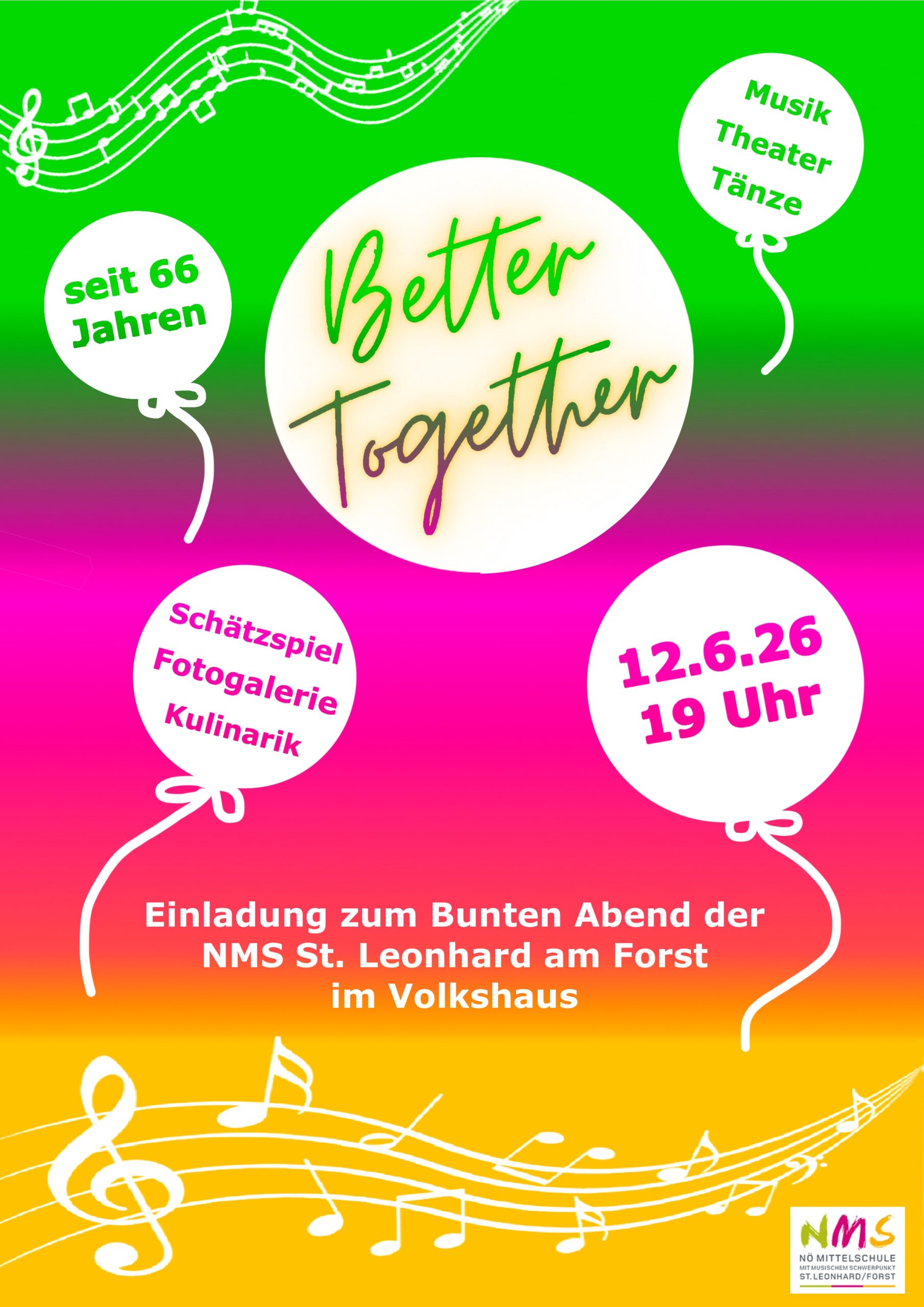 Am 12.6.2026 ab 19:00 Uhr präsentieren wir Musik, Theater und Tänze im Volkshaus St. Leonhard am Forst.