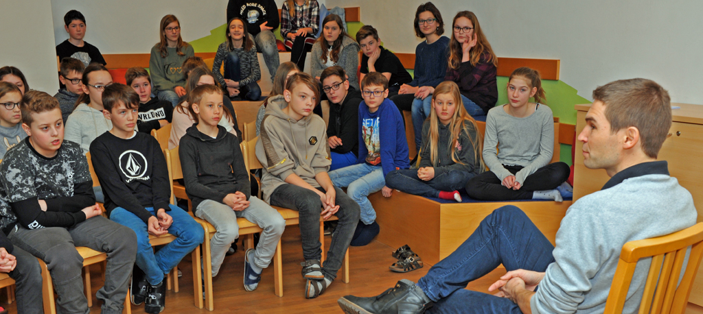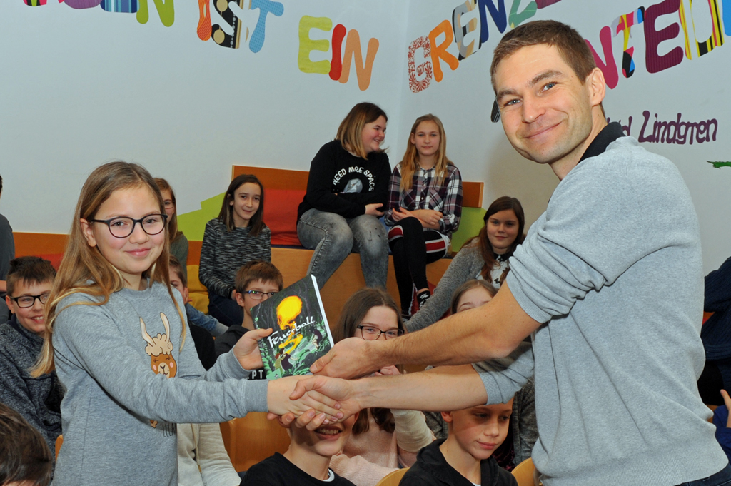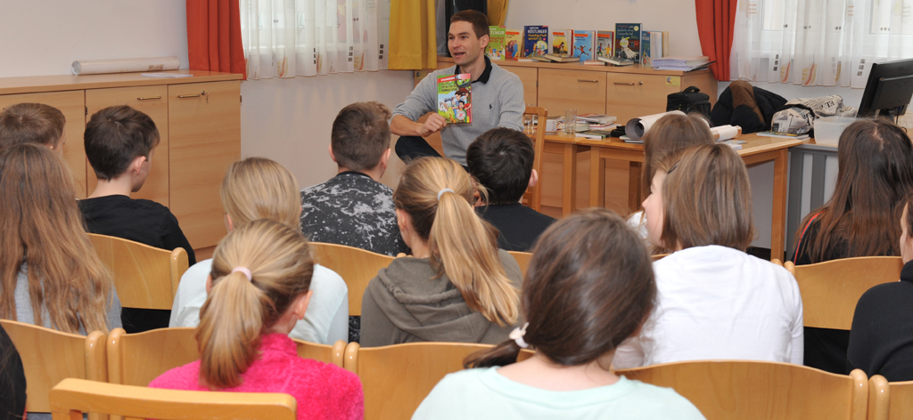 Er schaffte es, die Schülerinnen und Schüler für die Inhalte zu begeistern und rundete seine Lesungen in den 1. und 2. Klassen mit einem Gewinnspiel sowie in den 3. und 4. Klassen mit Infos über den erfolgsversprechenden Aufbau von Geschichten ab.