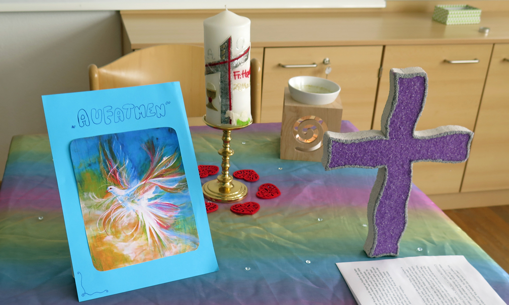 Mithilfe verschiedener Impulse aus dem Lied „Atme in uns Heiliger Geist“, einer Übung zur bewussten Wahrnehmung ihres Lebensatems und der Bibelstelle über das Pfingstwunder, hielten die TeilnehmerInnen mitten im Alltag inne. Über die Atmung lenkten sie die Aufmerksamkeit nach innen und „beobachteten“ das Gelungene und darauf, wo im Hinblick auf sich selbst, auf den Mitmenschen, die Erde und die Beziehung zu Gott noch Handlungsbedarf besteht.