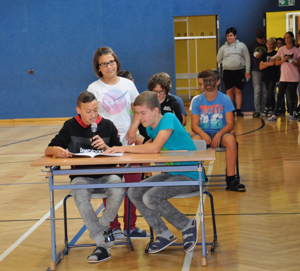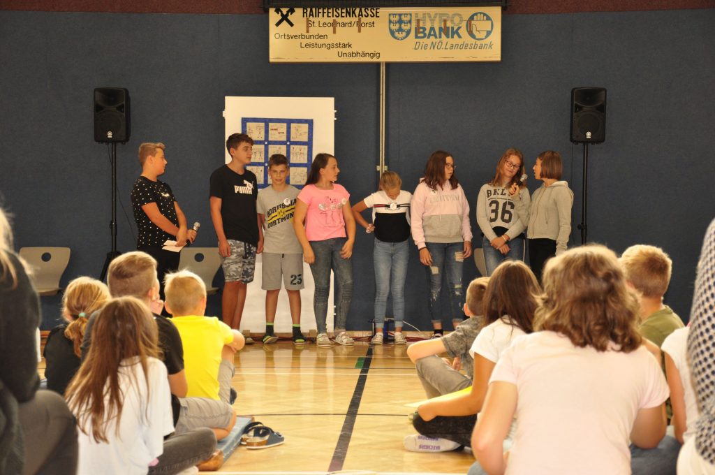 Bereits am Freitag in der ersten Schulwoche fand ein Projekttag zum Thema „Sozialkompetenzen“ statt. Am Vormittag erarbeiteten die Klassen jahrgangsmäßig verschiedene Themen, die sie zum Abschluss in einer Schulversammlung darboten. Die neuen Schülerinnen und Schüler präsentierten ihre erarbeiteten Klassenregeln.