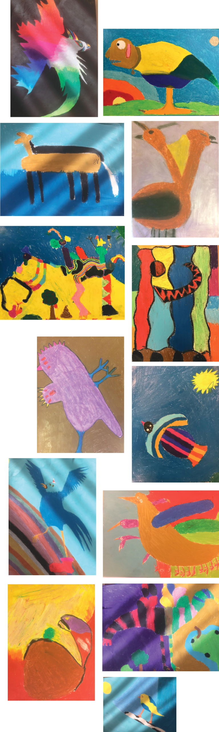 Kreatives Arbeiten im Zeichenunterricht steht an der Tagesordnung. Die 2. Klassen fertigten eine Vorzeichnung von Vögeln nach Picasso an, nach diesem Entwurf setzten die SchülerInnen der 2. Klassen ihre Ideen mit Ölkreide um. Die Arbeiten konnten noch vor Schulschließung fertig gestellt werden.