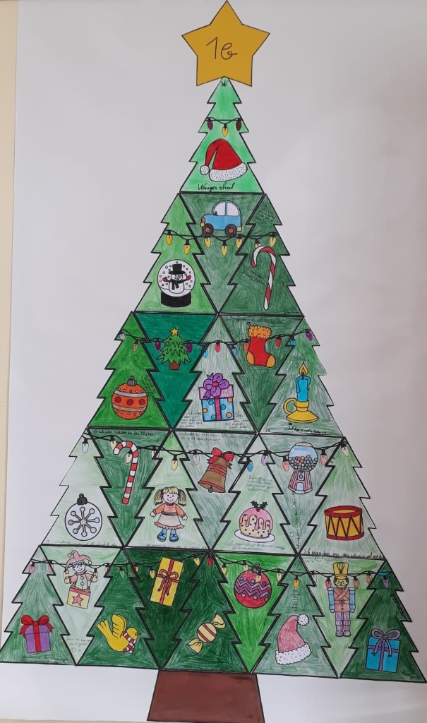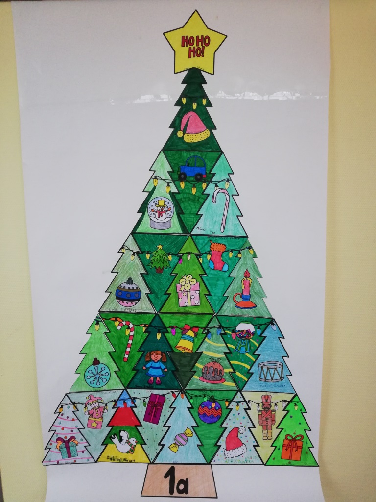 Nach der Phase des Homeschoolings beschäftigten sich die Schülerinnen und Schüler der Klassen 1a und 1b in Sozialem Lernen mit der Klassengemeinschaft. Dabei formulierten die Kinder einerseits Weihnachtswünsche für das Zusammenleben in der Klasse, reflektierten aber auch, was in der Klasse bereits gut funktioniert. Dazu bekam jedes Kind einen Christbaum, den es gestalten konnte. In einer Klasse wurden auf diesem Christbaum dann auch die Wünsche festgehalten. Alle kleinen Christbäume einer Klasse fügten wir dann zu einem großen Christbaum zusammen, der von jedem Kind der Klasse einen Teil enthält. Unsere großen Christbäume schmücken jetzt unser Schulhaus und sorgen so für weihnachtliche Stimmung.