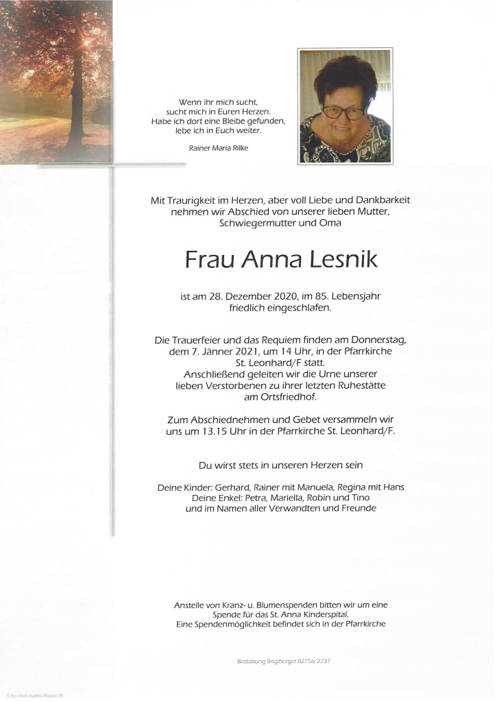 Kurz nach der Gründung unserer Schule 1960 wurde Anna Lesnik dieser zur Dienstverrichtung zugeteilt. Als begeisterte Pädagogin begleitete sie viele Schülerinnen und Schüler durch ihre Hauptschulzeit und hat unsere Schule in 35 Unterrichtsjahren wesentlich mitgeprägt. Eltern und Kinder schätzten ihre freundliche Art und ihre fachliche Kompetenz. Besonders am Herzen lagen ihr die Förderung guter Schülerinnen und Schüler und als Schülerberaterin die Vorbereitung und Begleitung der heranwachsenden Jugend auf das spätere Leben. Als Kollegin war sie uns Vorbild und als solches wird sie uns auch in Erinnerung bleiben.