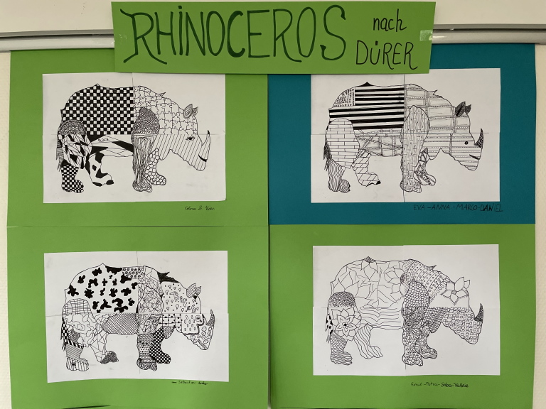 In Viererteams arbeiteten die Künstlerinnen und Künstler der 3. Klassen an verschiedenen Strukturen und Muster. Diese lassen die Rhinozerosse sehr lebendig aussehen.