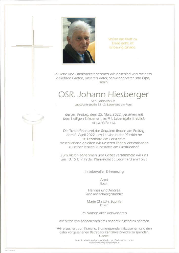 OSR Johann Hiesberger, Hauptschuldirektor in Ruhe, der am 25. März 2022 im 91. Lebensjahr von dieser Welt abberufen wurde. Seit Gründung der Hauptschule wirkte Johann Hiesberger als Lehrer für Mathematik und Physik und trug wesentlich zum Aufbau unserer Bildungsstätte bei. Als Klassenvorstand begleitete er viele Schülerinnen und Schüler durch ihre Schulzeit.