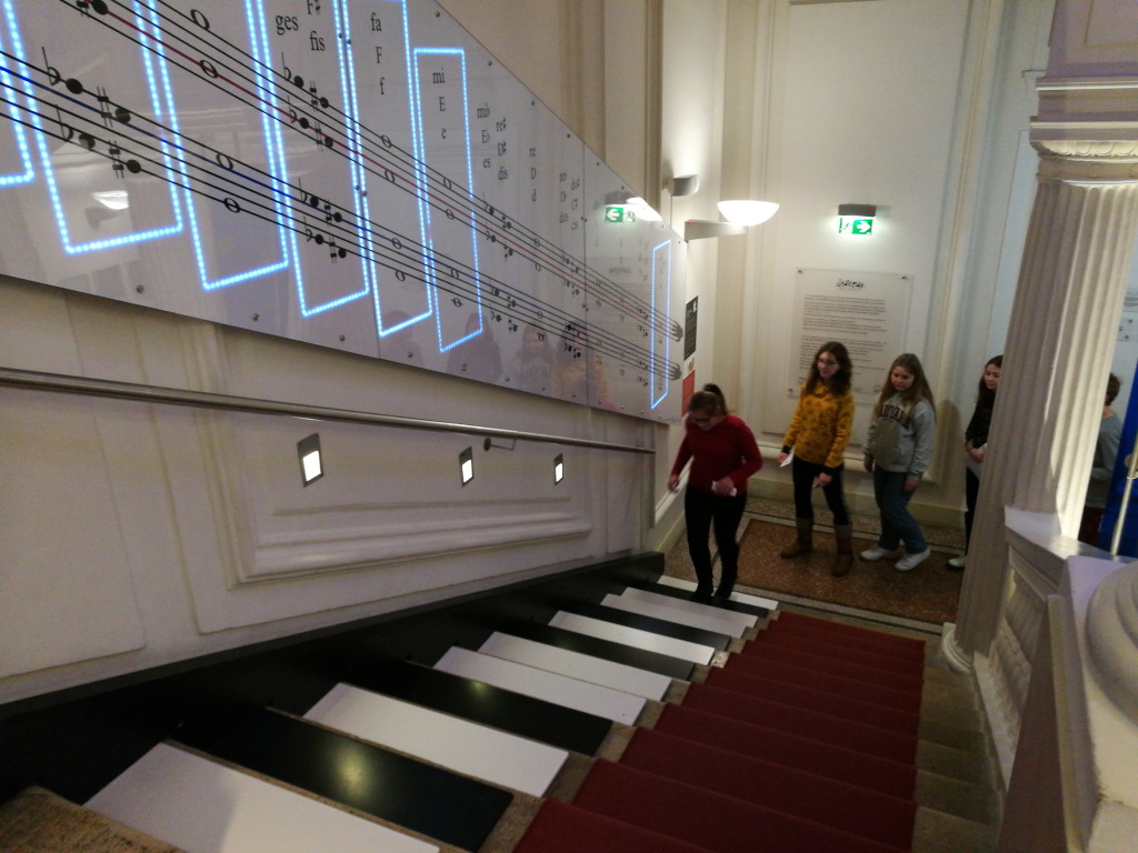 Mit der U-Bahn ging es vom Westbahnhof zum Stephansdom und von dort aus über die schöne Kärntnerstraße entlang direkt zum „Haus der Musik“. Dort angekommen, war das erste Highlight eine Klaviertreppe auf der wir Spaß daran hatten verschieden Klänge zu erzeugen. Eine der vielen Stationen führte uns zum Kinosaal, wo wir die Lieder der Wiener Philharmoniker anhören durften. Neben lehrreichen Informationen über das Neujahrskonzert, lernten wir auch vieles über Komponisten wie W.A. Mozart, Johann Strauss und Ludwig van Beethoven. Außerdem wissen wir nun einiges über die Akustik und ihre Schallwellen, dass Babies bereits im Mutterleib hören können und dass die Schildkröte das schlechteste Gehör hat!
