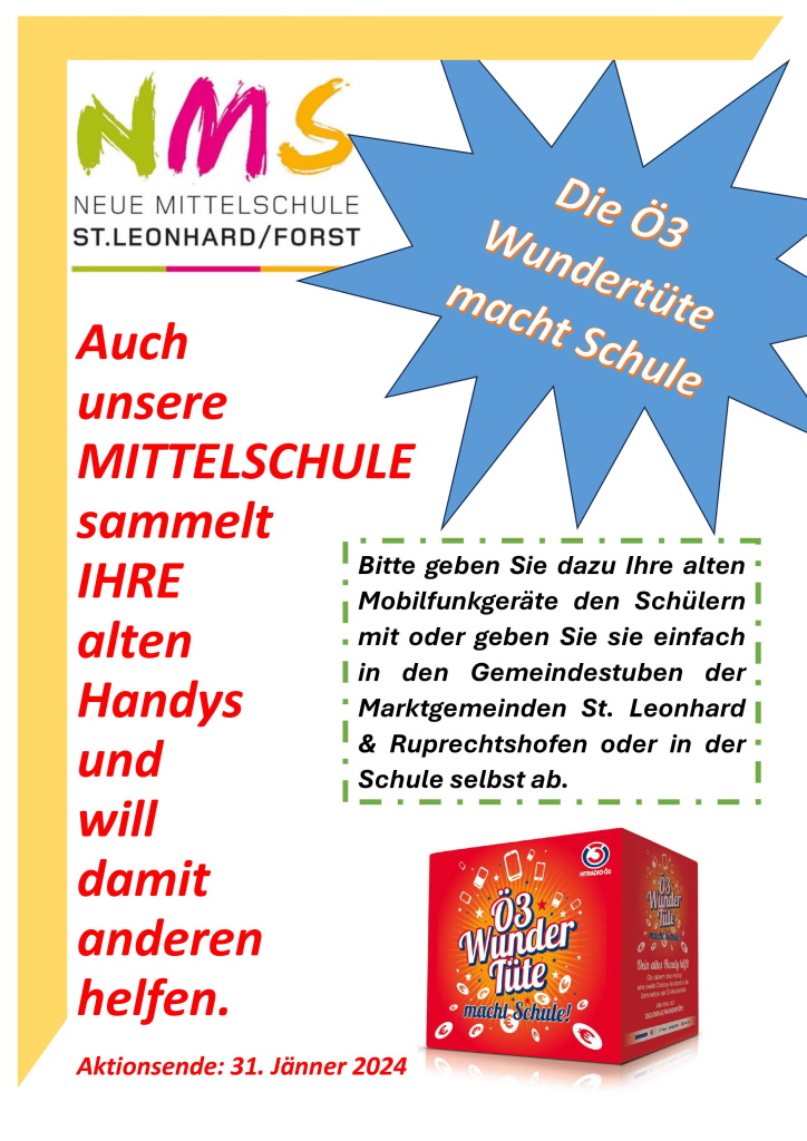 Unsere Schule macht dieses Jahr bei der Aktion „Ö3 Wundertüte macht Schule“ mit. Dafür sammeln wir benutzte Smartphones/Handys, die dann in eine Spende für Familien in Not in Österreich umgewandelt werden.